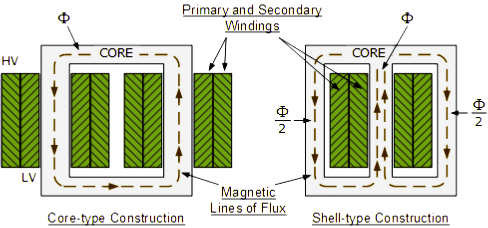 a) Core Type :- In this type, there is only one iron path and windings are wound over opposite limbs.