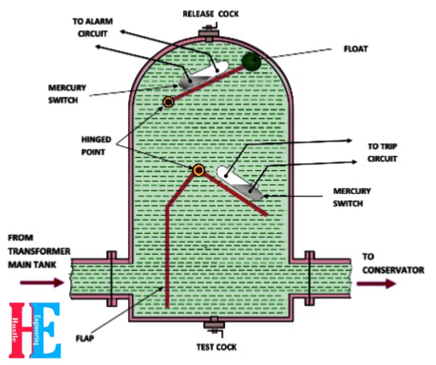 It looks like a dome shaped vessel placed in the connecting pipe between the conservator and the main tank. The relays carries two fundamental parts or element which are nothing but murcury based switches. Upper element Consists of murcury switch with a hinged float. The Lower element consist of murcury switch which is Fixed on the hinged flap placed in the lower part and in the direction of flow of oil from Transformer main tank to conservator tank. The upper element closes the alarm circuit whether the lower element closes the trip coil and trip the transformer through circuit breaker in case of any internal fault. Elements are in different in mass, so that they could judge the level of fault automatically.